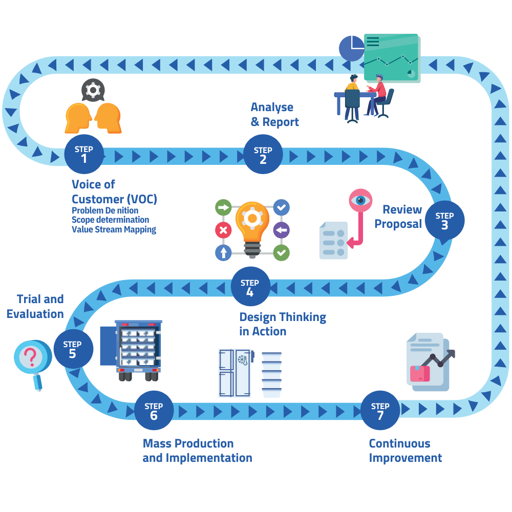 Discover our customer journey from initial insight to seamless integration. Our process, guided by Lean Six Sigma principles, focuses on continuous improvement and solving customer problems. By precisely identifying where the problem (waste) occurs in the process, we can effectively work toward the optimal solution.